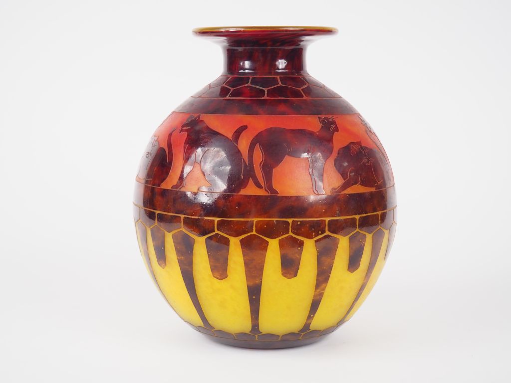 LE VERRE FRANCAIS. Vase 'Chats' en verre poudré jaune, dégradé rouge cuivre vers le haut. Motif dégagé à l'acide. H. : 25 cm.