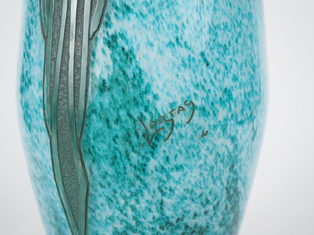 LEGRAS. Grand vase ovoide Art Déco en verre décor gravé en camée à l'acide sur fond marbré vert et bleu. Signé. H. 53 cm