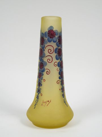 LEGRAS. Vase en verre gravé en camée à l'acide de guirlandes de fleurs stylisées bleu et mauve décor sur fond givré jaune, signé. H. 33.5 cm.