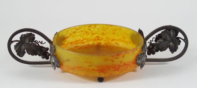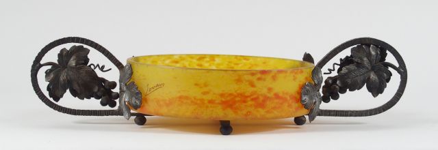 LORRAIN. Coupe Art Déco en verre marbré jaune orangé, monture en fer forgé à décor de pampres. Diam. : 25 cm