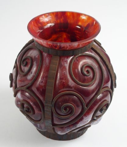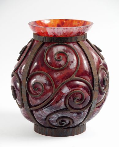 LORRAIN. Vase Art Déco en verre marbré rouge et brun nuancé de blanc, soufflé dans une monture en fer forgé, à décor de spirales. Signé. H. : 25 cm
