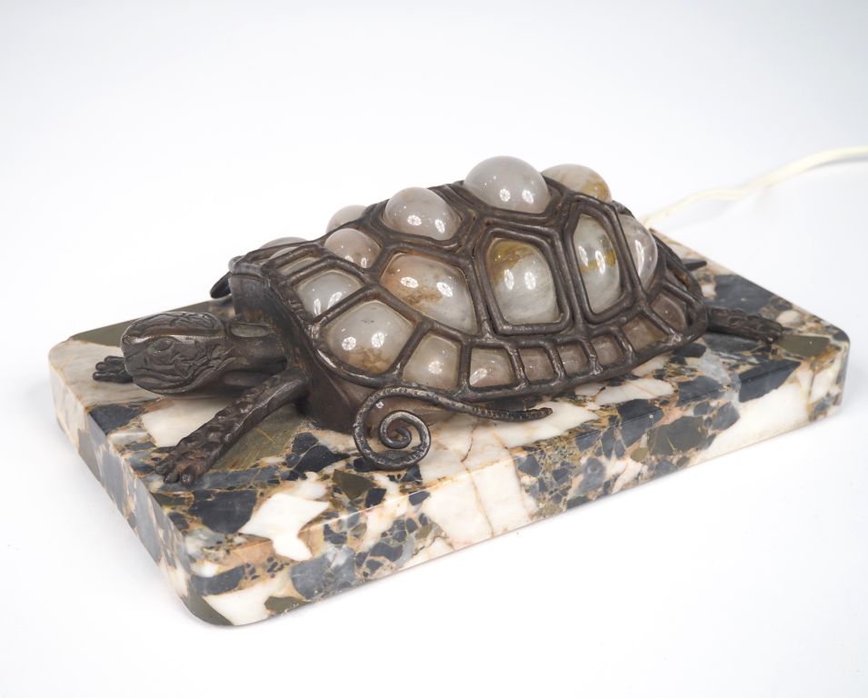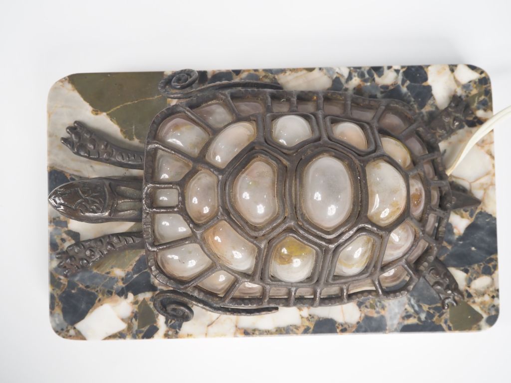 MULLER Frères et CHAPELLE Nancy. Lampe zoomorphe figurant une tortue en verre rose, jaune et blanc soufflé dans une armature en fer forgé, socle en marbre. Signée. Dim. 25,5 x 15 cm. Provenance : Collection particulière Monsieur R (Toulouse).