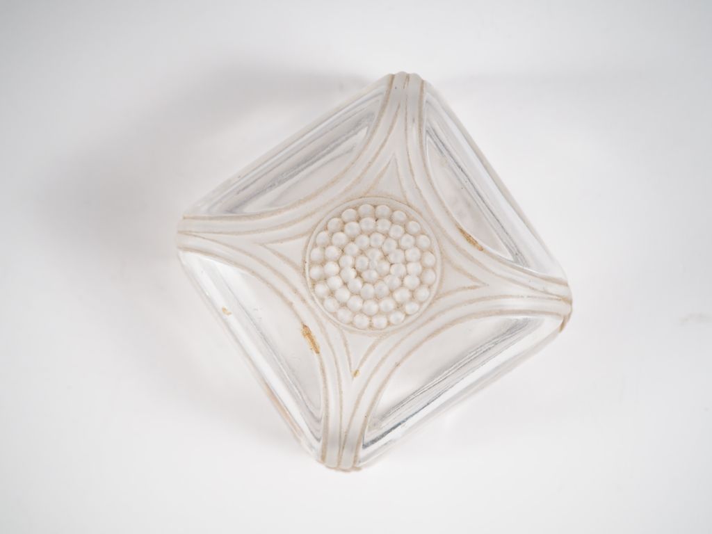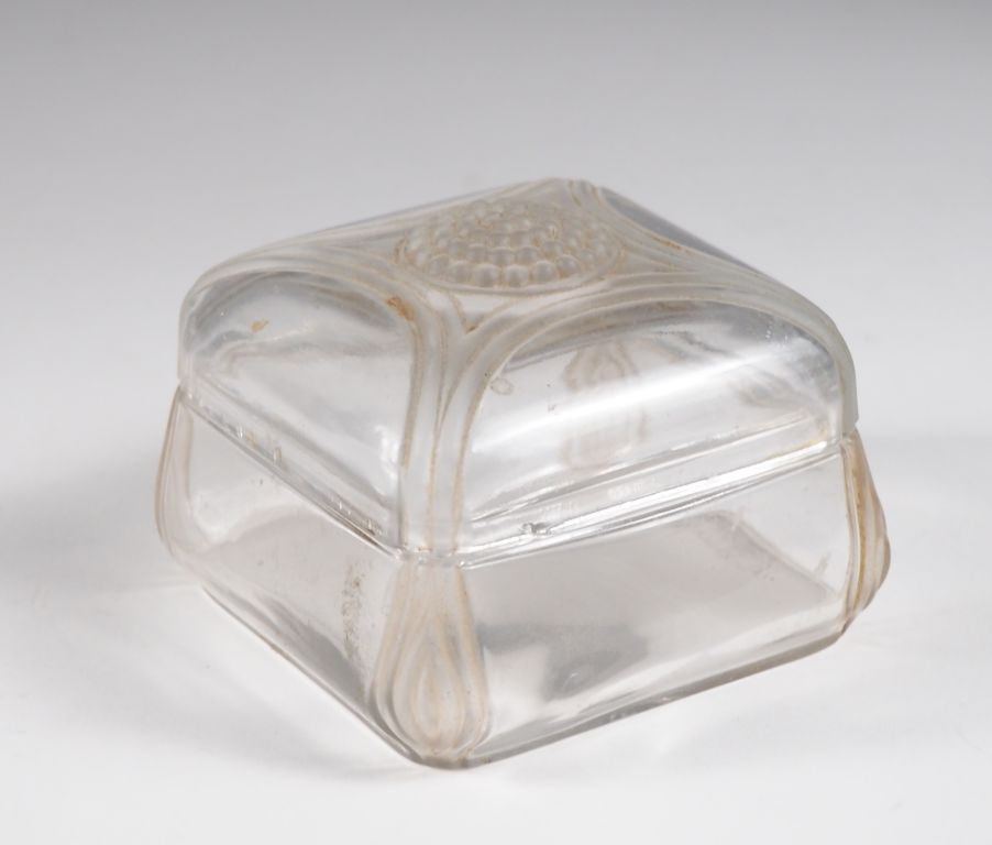 R. LALIQUE. Bonbonnière en cristal. Signé. H. 6,5 X 9 X 9 cm. (éclat et égrenure sur le couvercle)