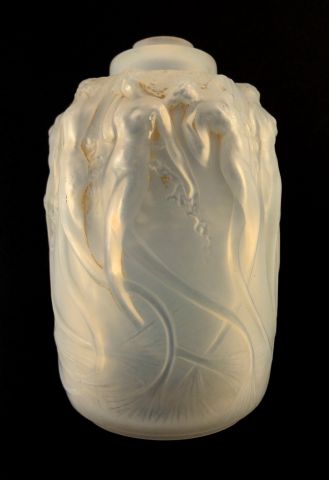 R. LALIQUE. Brûle-parfum en verre opalescent à décor de sirènes voir modèle. (manque la partie supérieure). Signature à la roue. H. 14 cm