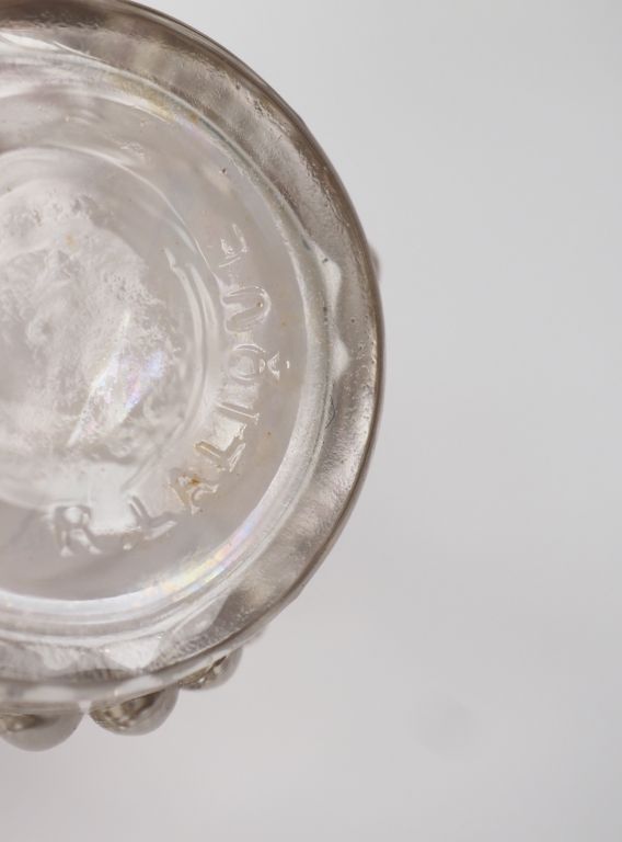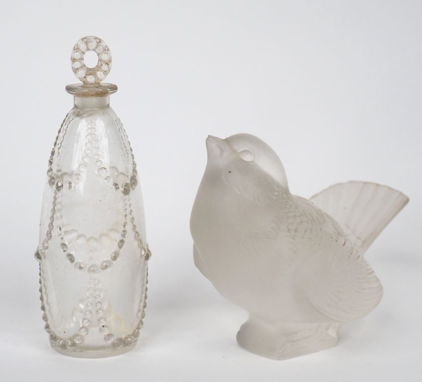 R. LALIQUE. "moineau" Sujet en cristal moulé Signé H. 9 cm (égrenure au bec et au socle) LALIQUE. Flacon en cristal à décor de collier de perles. Signé H. 12 cm