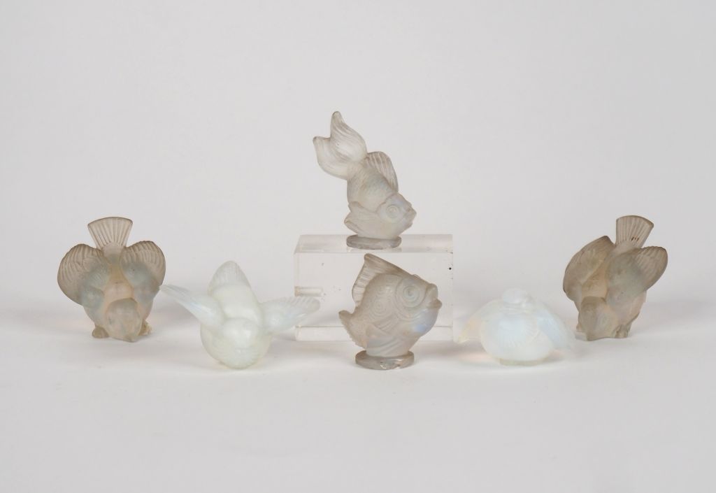SABINO. 6 petits sujets en verre moulé opalescent "poissons" et "4 oiseaux" certains signés (égrenures).