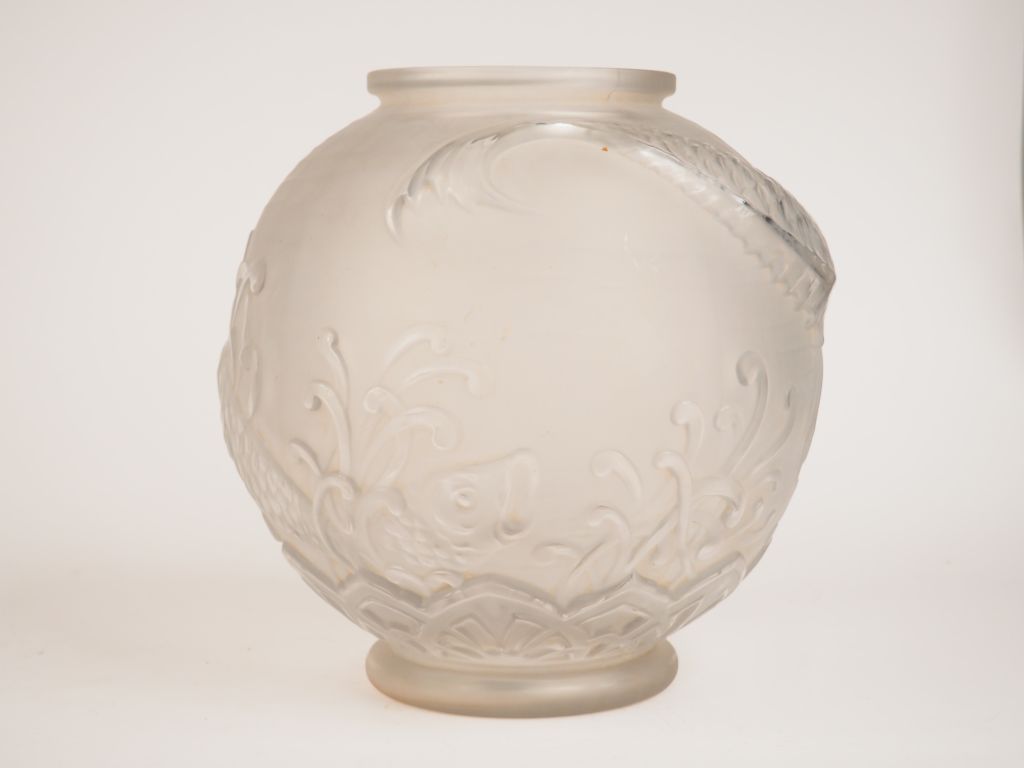 Vase boule At Déco en verre moulé, à décor de poissons et de plantes aquatiques. H. 29 cm
