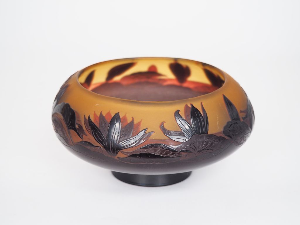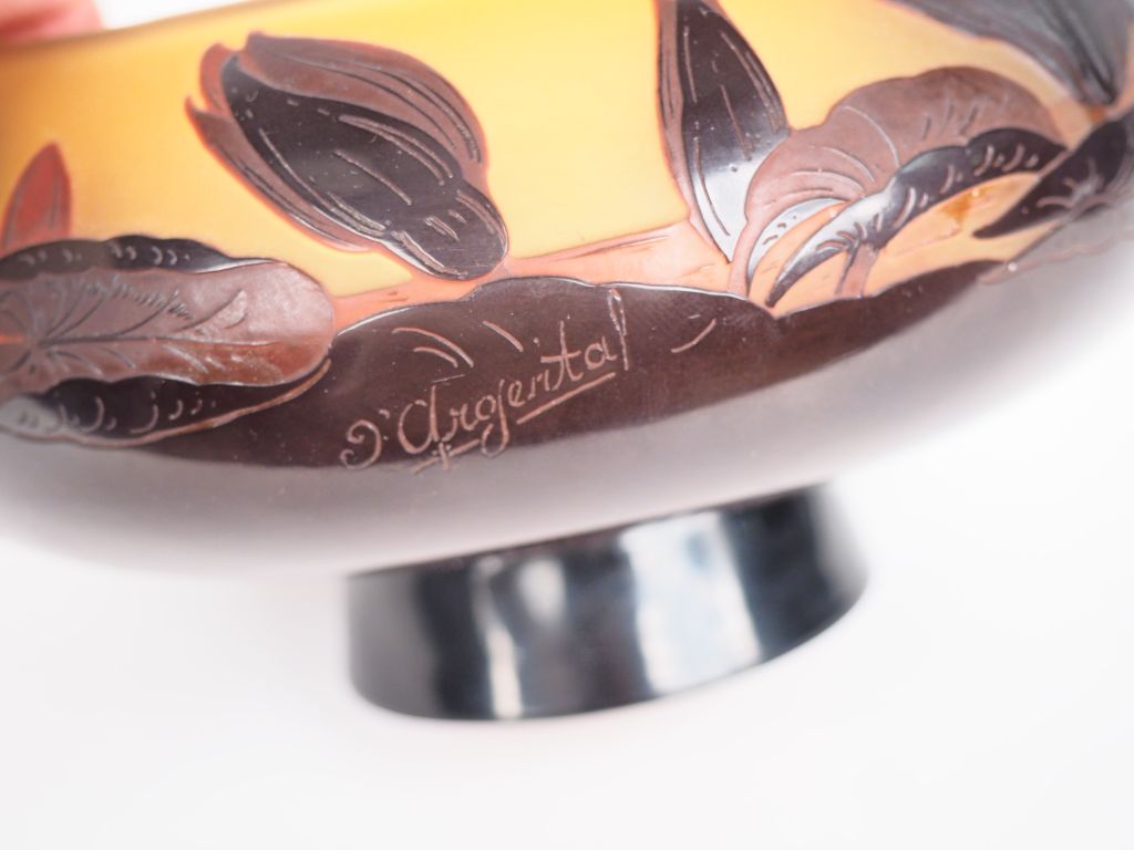 D'ARGENTAL. Coupe sur talon en verre gravé en camée et à l'acide à décor de nénuphars rouge et brun sur fond jaune. Signée. Dim. 9 x 16 cm.