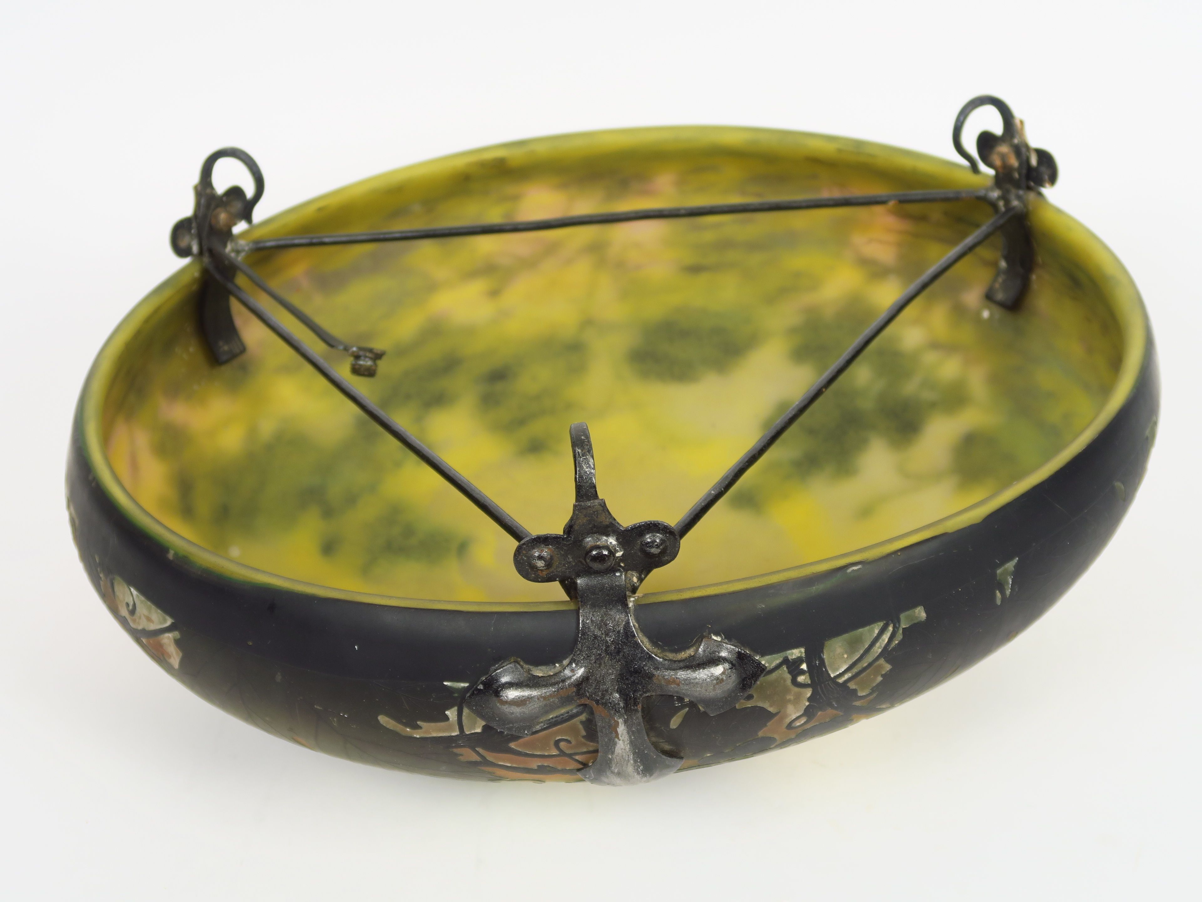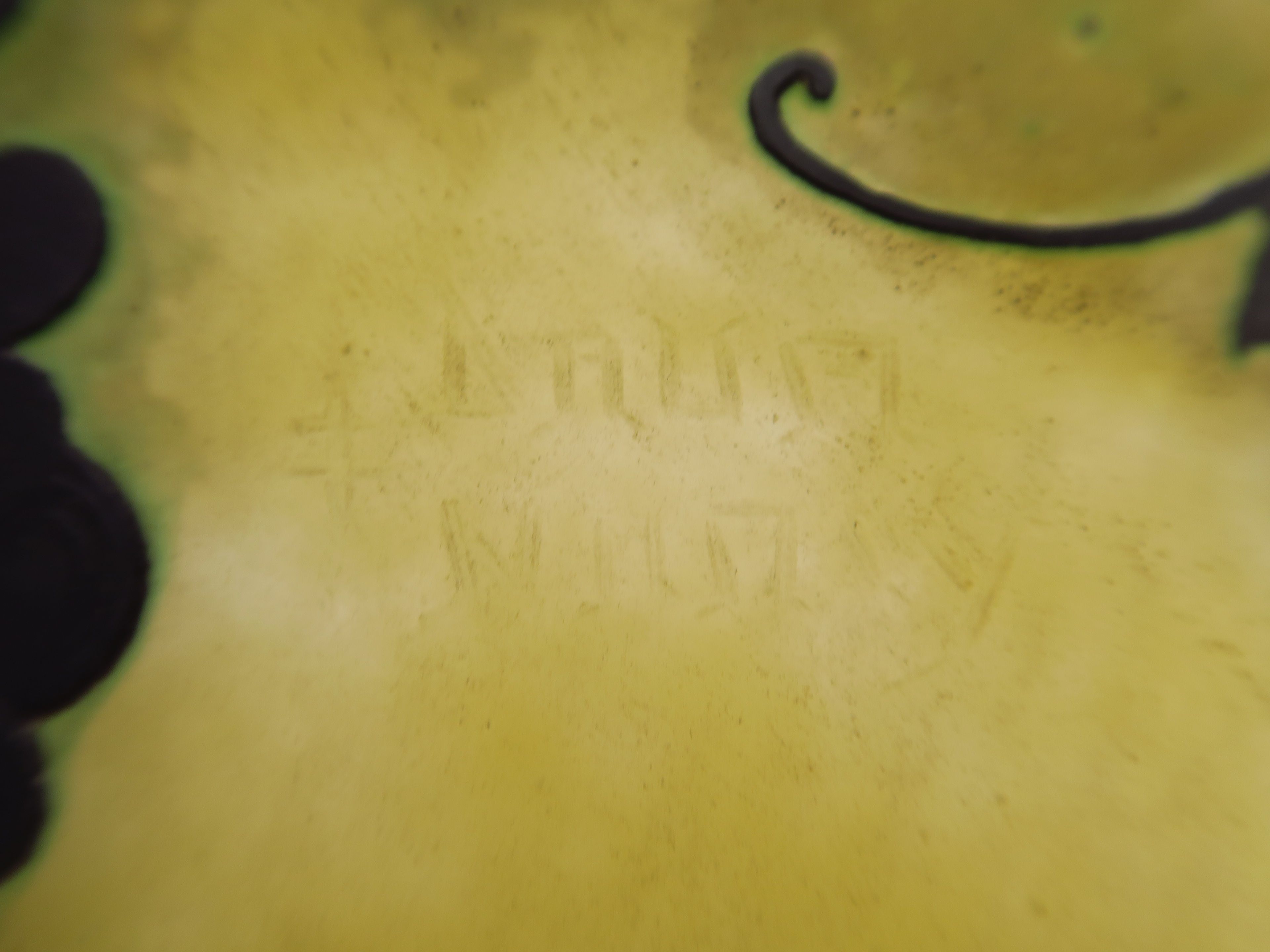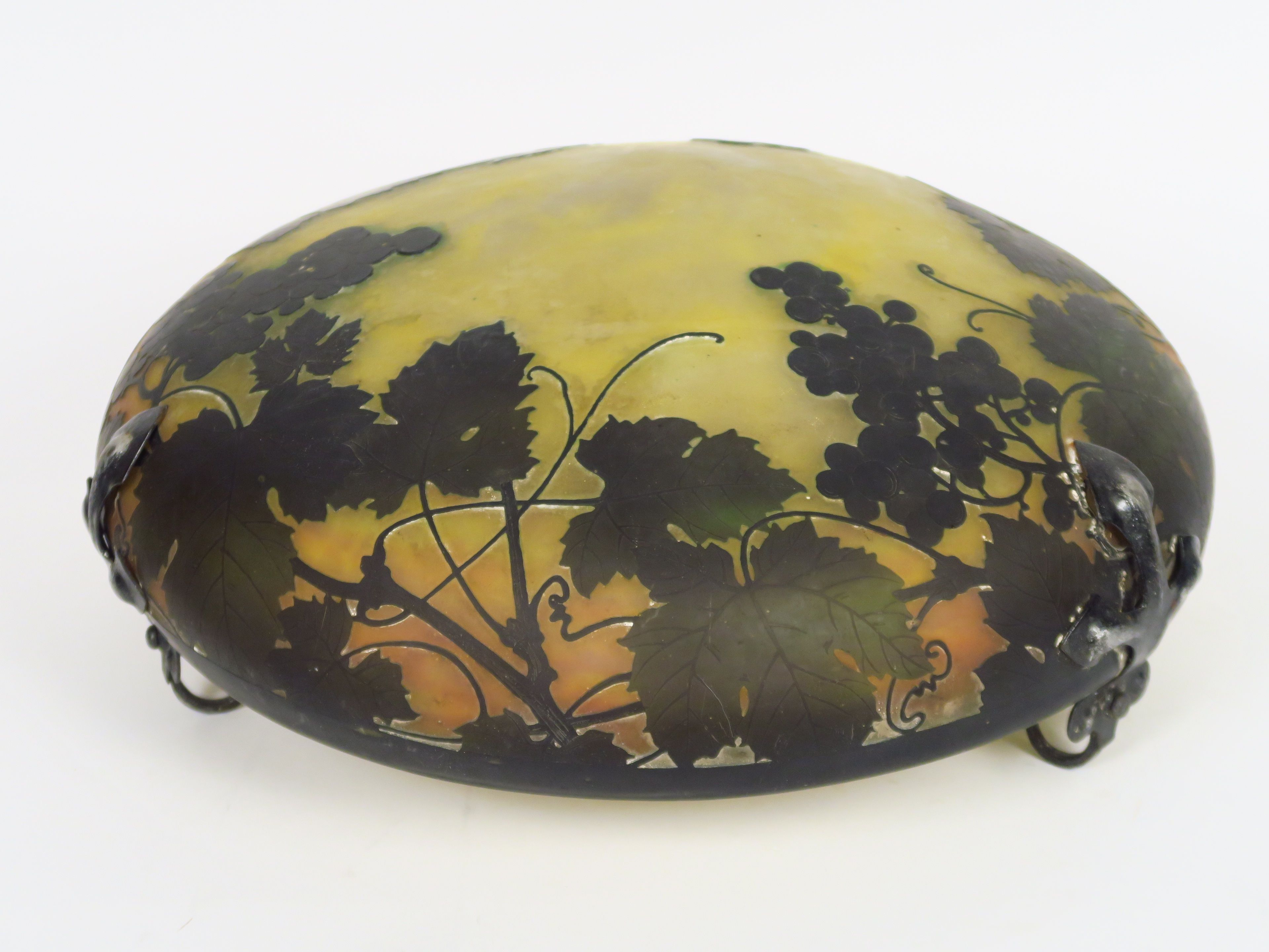 DAUM à Nancy. Plafonnier en verre, à décor gravé en camée et à l'acide de pampres sur fond jaune orangé. Signé. Diam. 39 cm