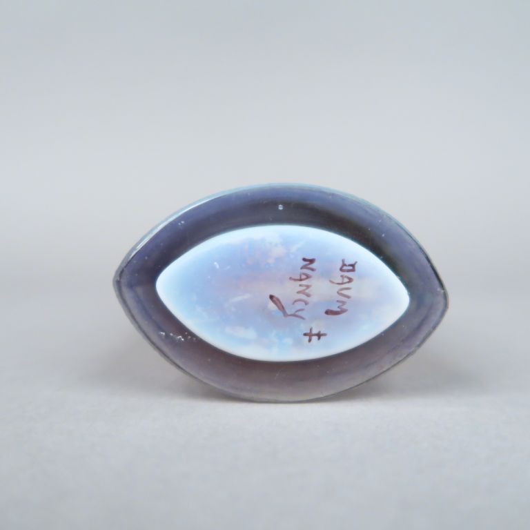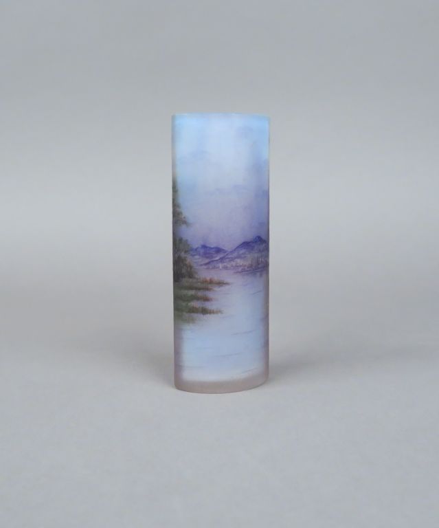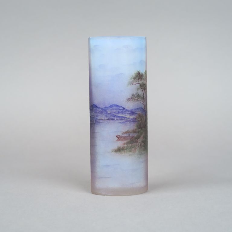 DAUM à Nancy. Vase à panse aplatie en verre, à décor émaillé d'un paysage lacustre montagneux. Signé. H. 17 cm (deux micros égenures au col)