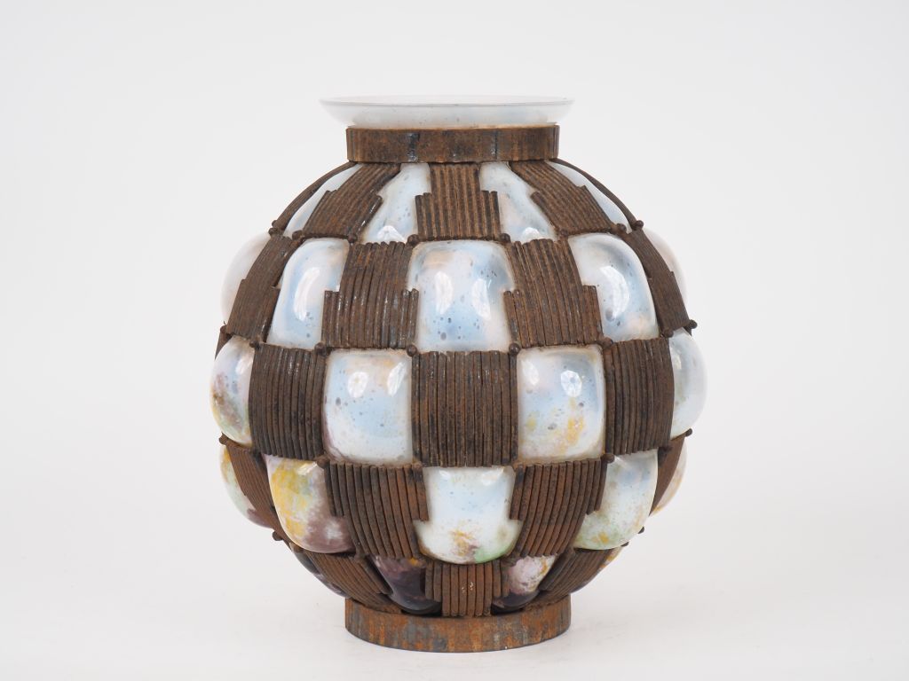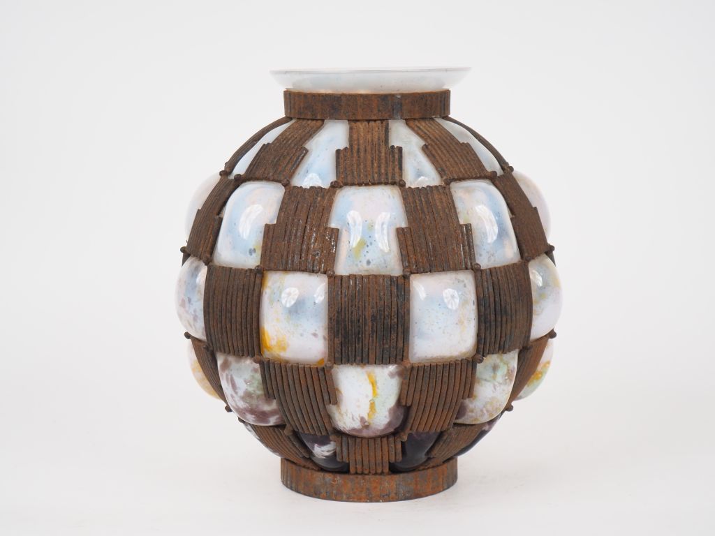 DAUM ET MAJORELLE. Vase en verre soufflé, très belle monture Art Déco en fer forgé à décor de godrons. Non signé. (petites égrenures sous le bord extérieur du col) H. 31 cm