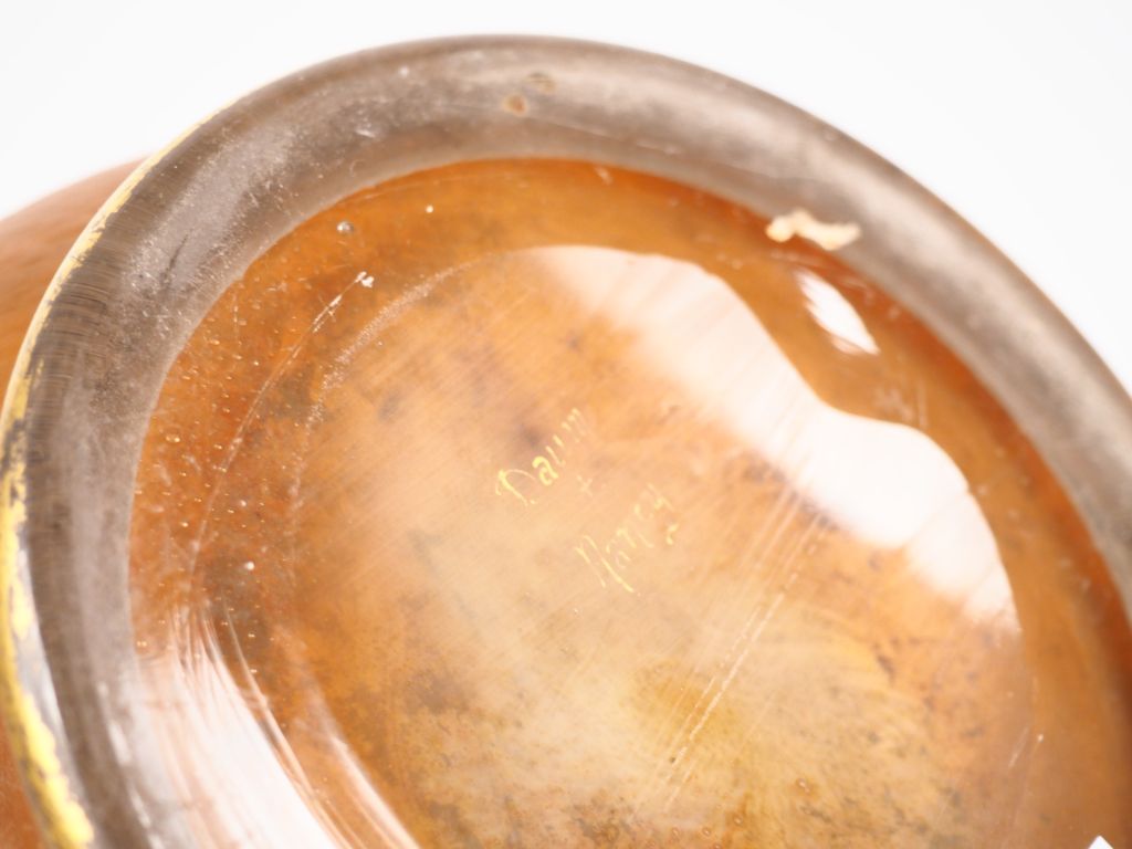 DAUM. Grand vase balustre à décor gravé en camée à l'acide et émaillé de glycine rouge et mauve sur fond vert sur le haut et orangé sur le bas , une partie du décor est placée sur une bande à fond doré. Signé Daum à Nancy H. 51 cm
