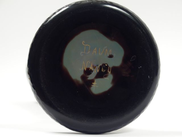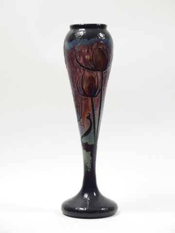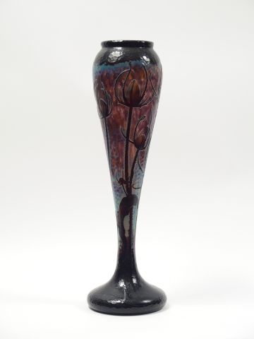 DAUM. Grand vase en verre, à décor de chardons bleus et mauves sur fond lustré et martelé. Signé. H. : 50,5 cm