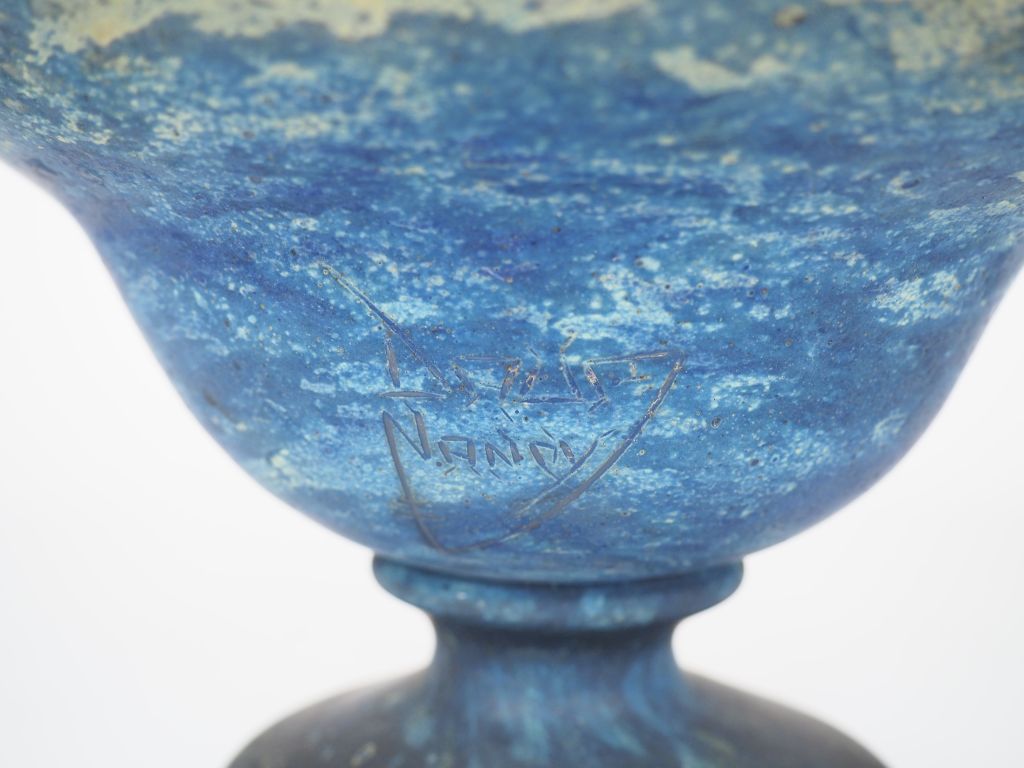 DAUM. Grande coupe sur pied en verre marbré bleu et jaune. Signée. H. 22 cm