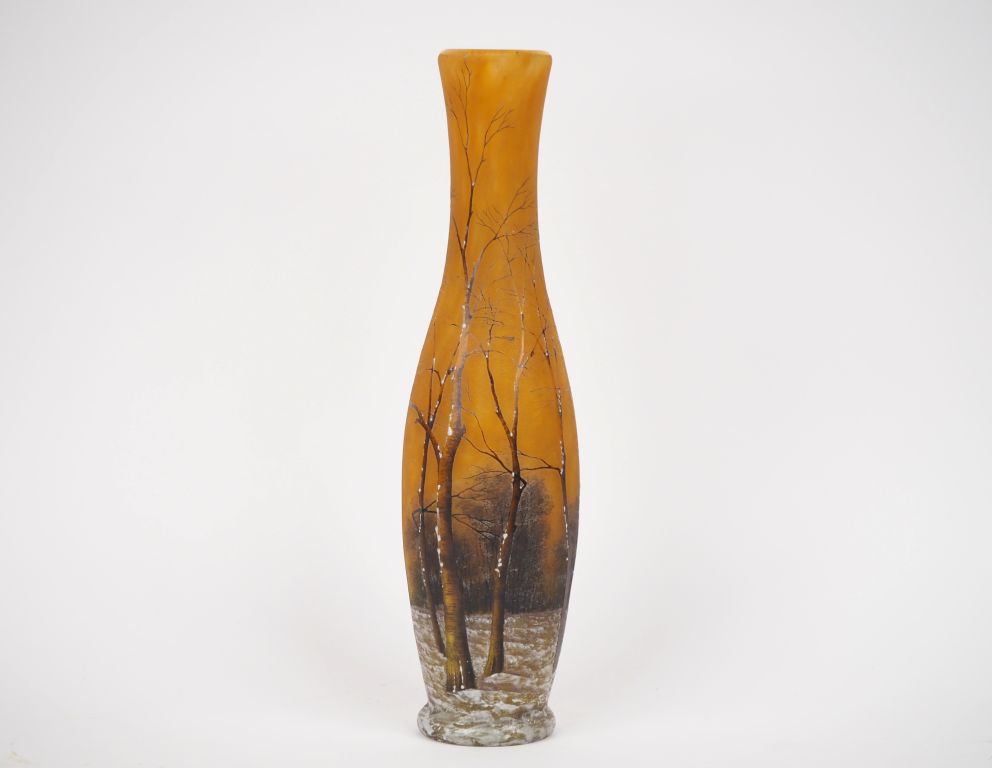 DAUM. Nancy. Grand vase balustre en verre émaillé et polychrome à décor de paysage d'hiver. Signé. H. 35 cm