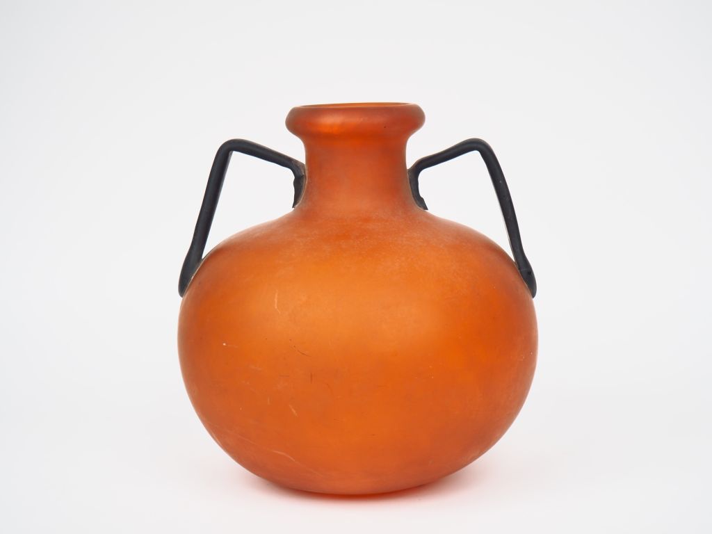 DAUM NANCY. Vase à anses en verre rouge orangé et noir, anses appliquées à chaud. Signé (fel et petites égrenures) H. 28 cm