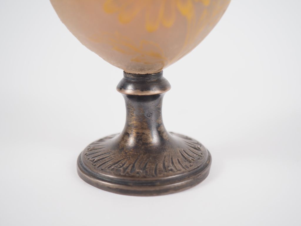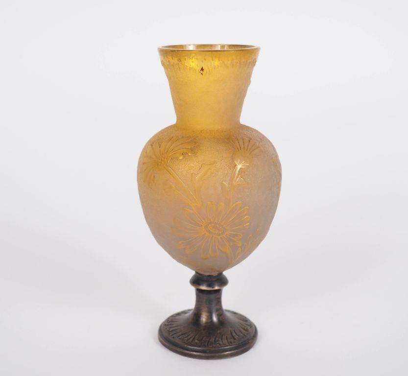 DAUM Nancy. Vase en verre jaune nuancé à décor polychrome et doré gravé et dégagé à l'acide de marguerites. Piètement piedouche en argent. Légendé : "Un peu, beaucoup, passionément…". Signé. H. 13 cm.