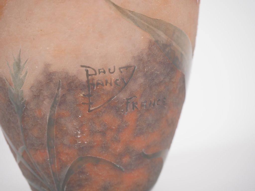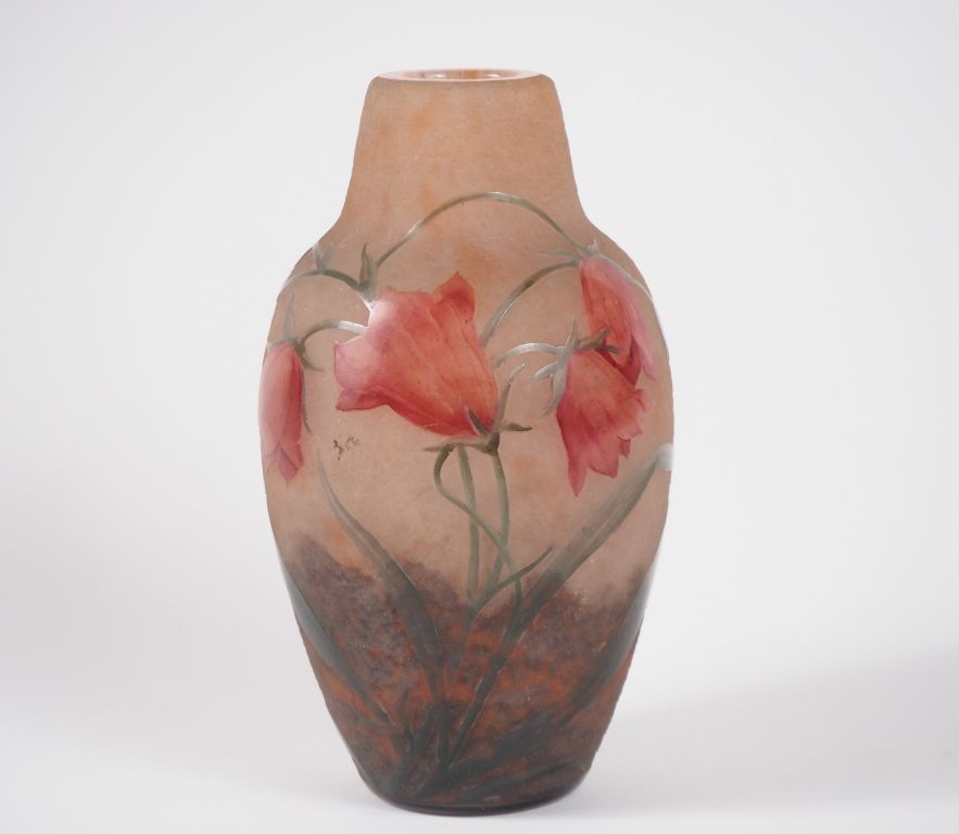 DAUM. Vase en verre à décor émaillé de fleurs Signé Daum Nancy France H. 18 cm (micro bulles de cuisson, micro choc, quelques rayures sous la base)