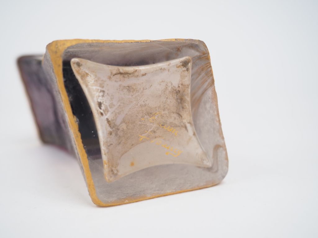 DAUM. Vase en verre emaillé à décor d'iris sur fond mauve dégradé, réhaussé d'or. Signé. H. : 11,2 cm.