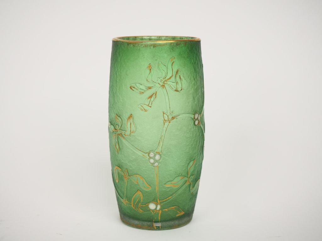 DAUM. Vase en verre givré vert à décor émaillé blanc et doré de guis Signé Daum Nancy. H. 12,5 cm