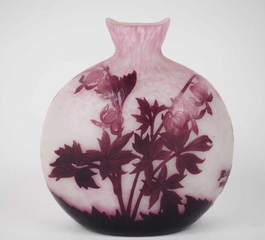 DELATTE. Vase ovoide à panse applatie en verre à décor gravé en camée et à l'acide de fushias mauves sur fond blanc nuancé de mauve.