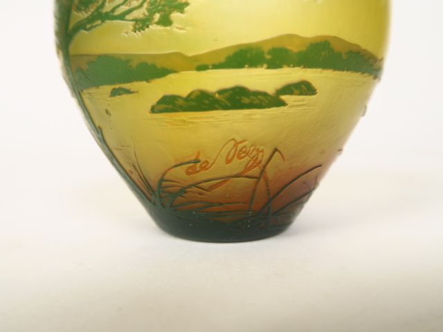 DEVEZ. Petit vase en verre, à décor gravé en camée et à l'acide de paysage lacustre. Signé. H. 7,5 cm