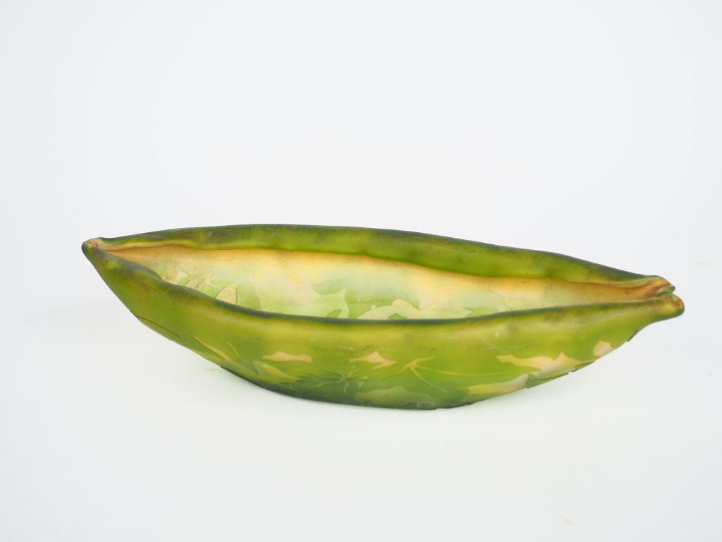GALLE. Coupe oblongue en verre à décor gravé en camée à l'acide de feuillage blanc sur fond vert. Signée. Dim. 6 x 28 x 12 cm.