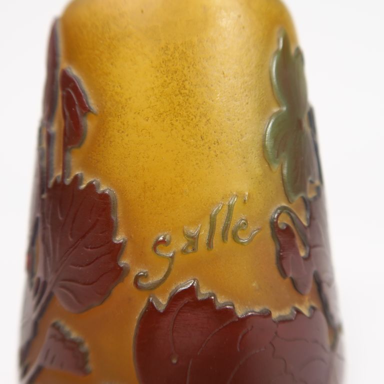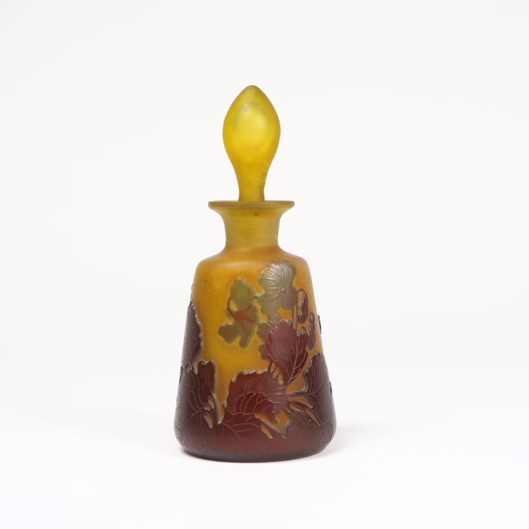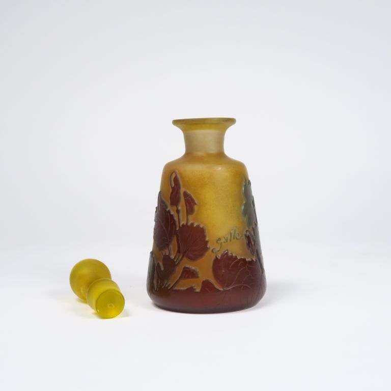 GALLE. Flacon en verre gravé en camée et à l'acide à décor de fleurs sur fond jaune bleu et brun. Signé. H. : 16 cm.