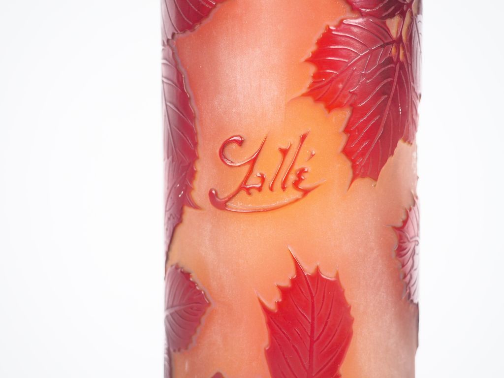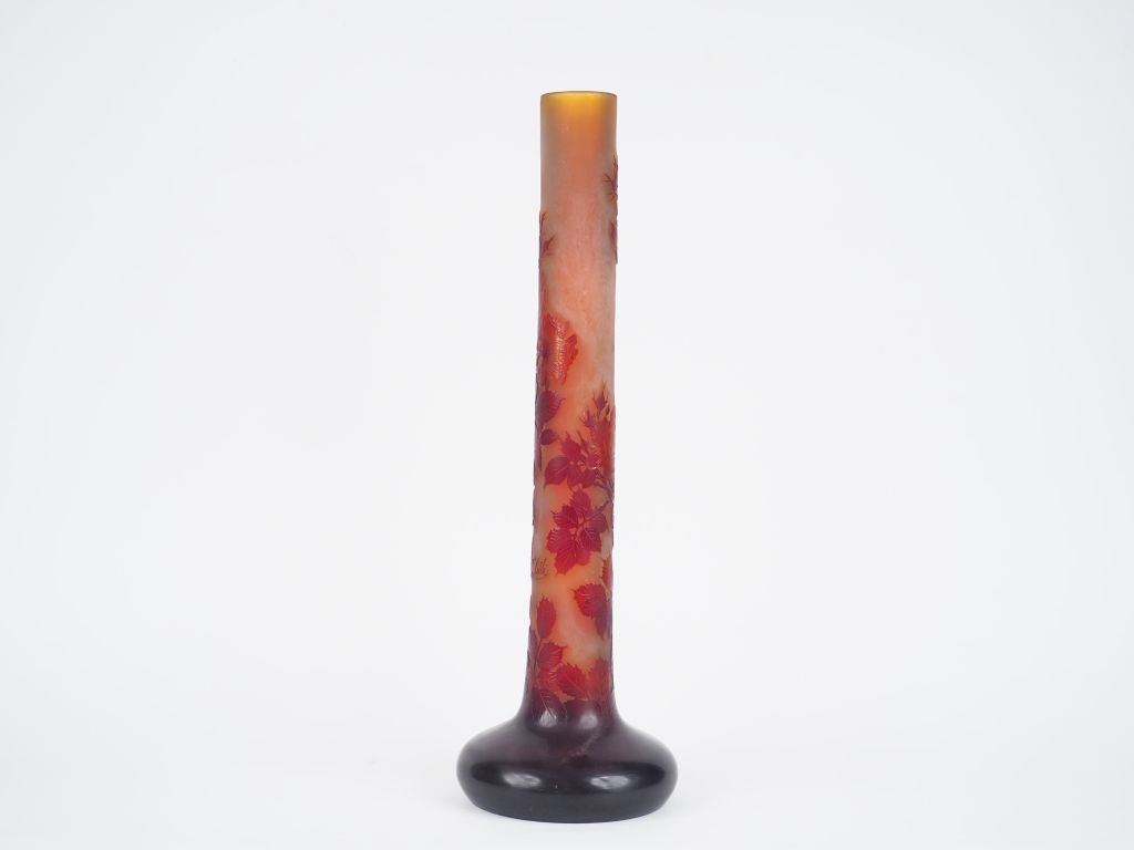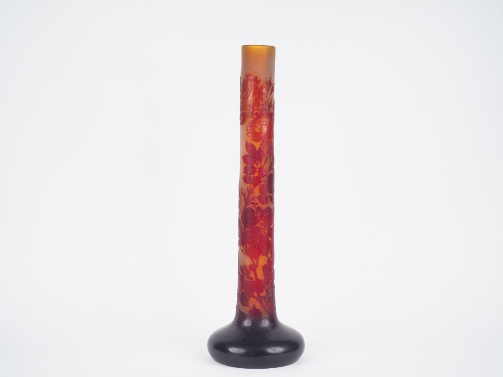GALLE Grand vase tube en verre à décor gravé en camée et à l'acide de roses rouges sur fond clair. Signé. H : 60 cm.