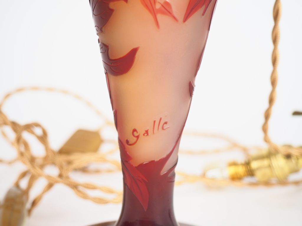 GALLE. Lampe en verre à décor gravé en camée et à l'acide de motifs "cœur de Marie" sur fond jaune. Signée sur la base et sur l'abat-jour. H. 36,5 cm.