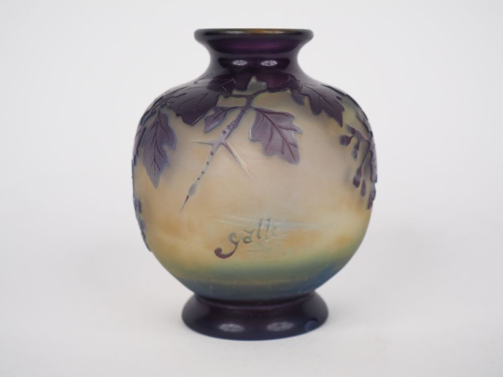 GALLE. Petit vase boule sur piédouche en verre gravé à décor en camée et à l'acide de fleurs et de feuilles bleues sur fand jaune Signé. H. 10 cm
