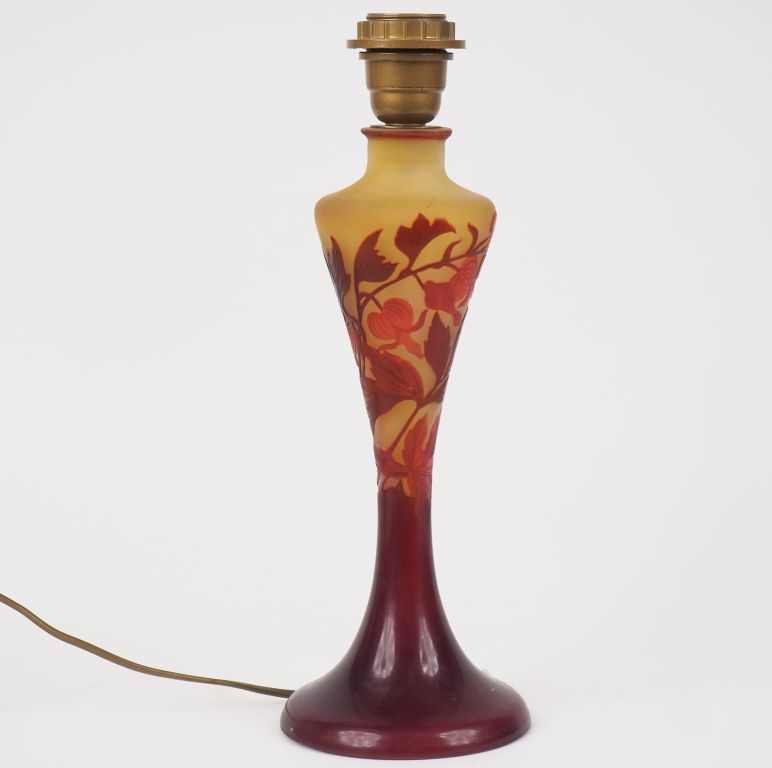 GALLE. Pied de lampe en verre à décor gravé en camée et à l'acide de fushias rouges sur fond jaune. H. 30 cm