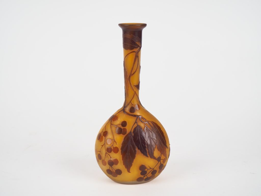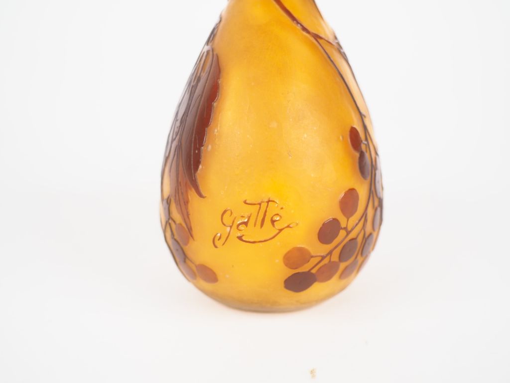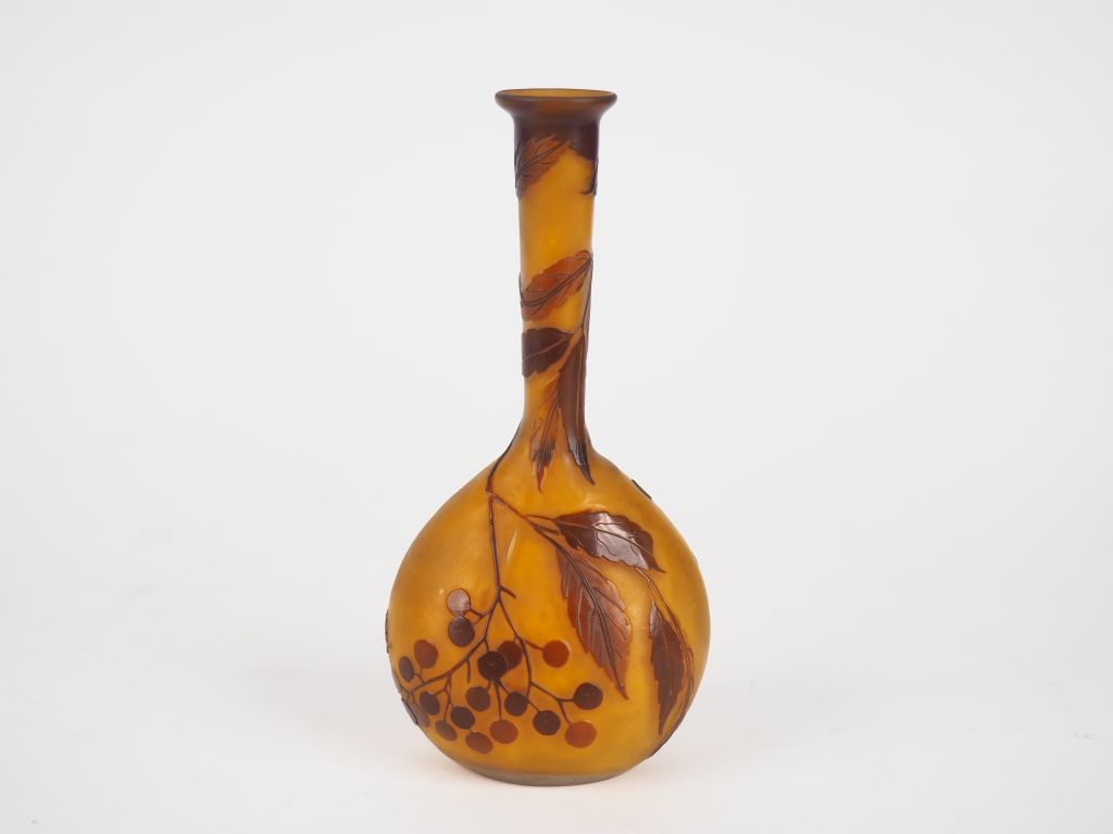 GALLE. Soliflore en verre à décor gravé en camée à l'acide de baies et de feuillage brun sur fond rose orangé. Signé H. 17 cm. (petite bulle de cuisson).
