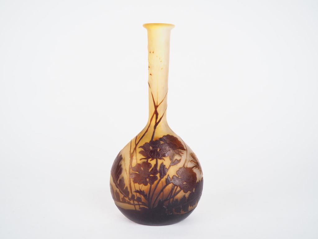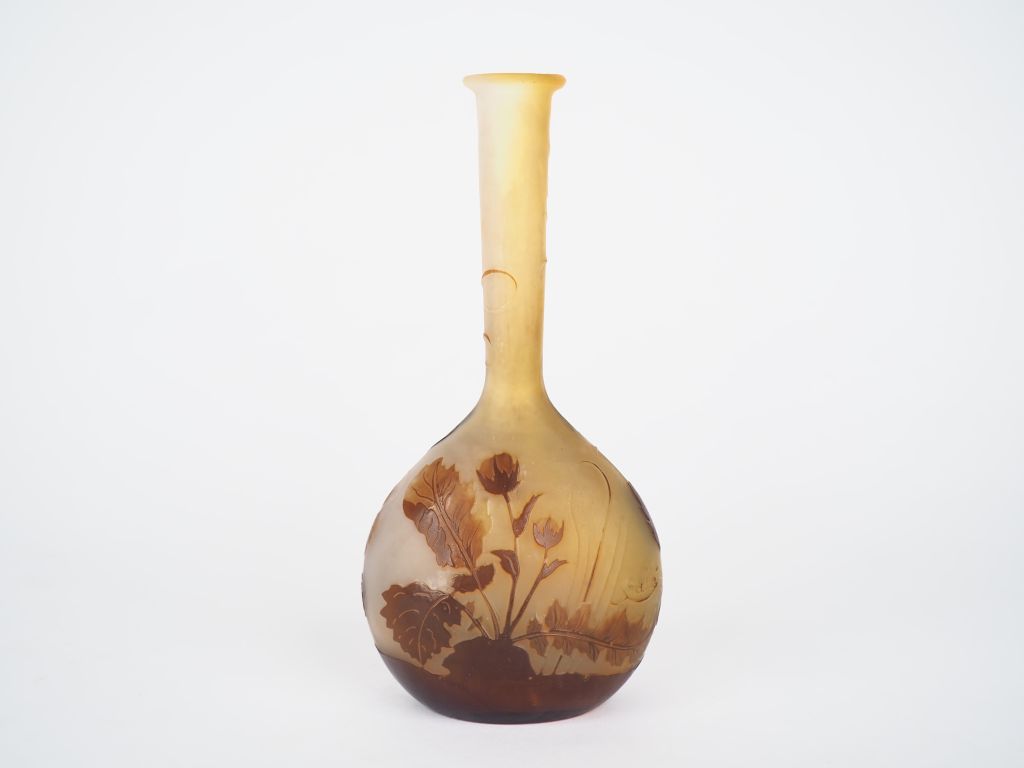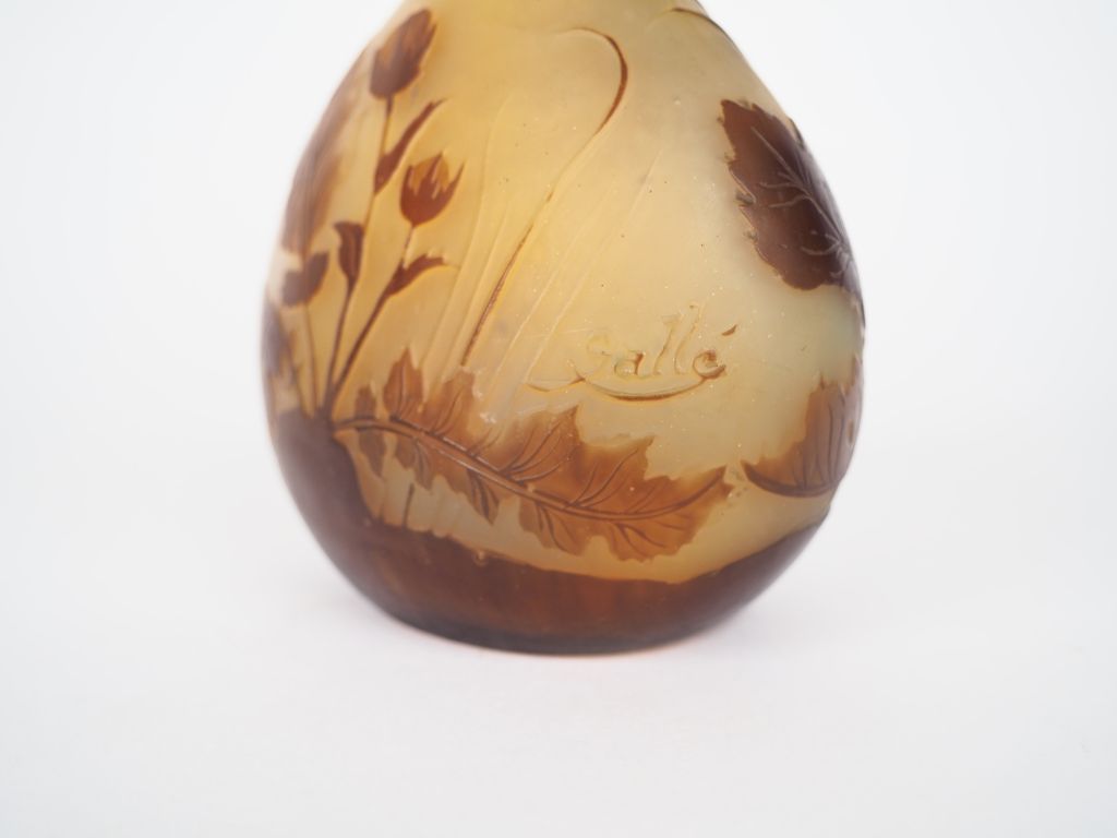 GALLE. Soliflore en verre à décor gravé en camée à l’acide de fleurs brun sur fond blanc nuancé de jaune. Signé. H. 17 cm.