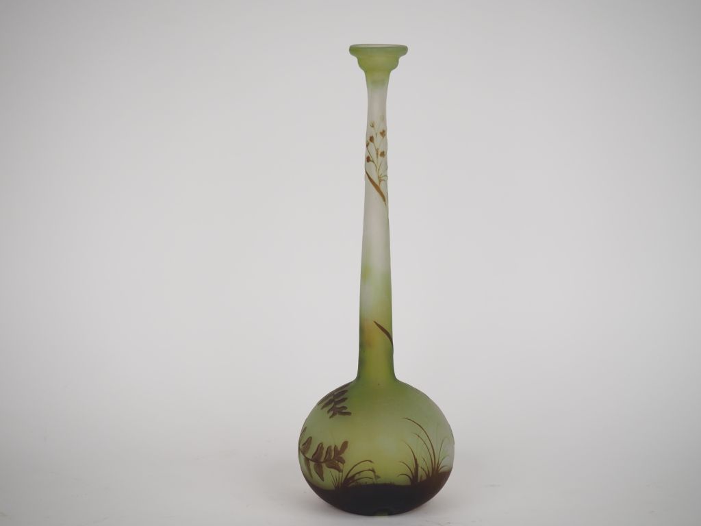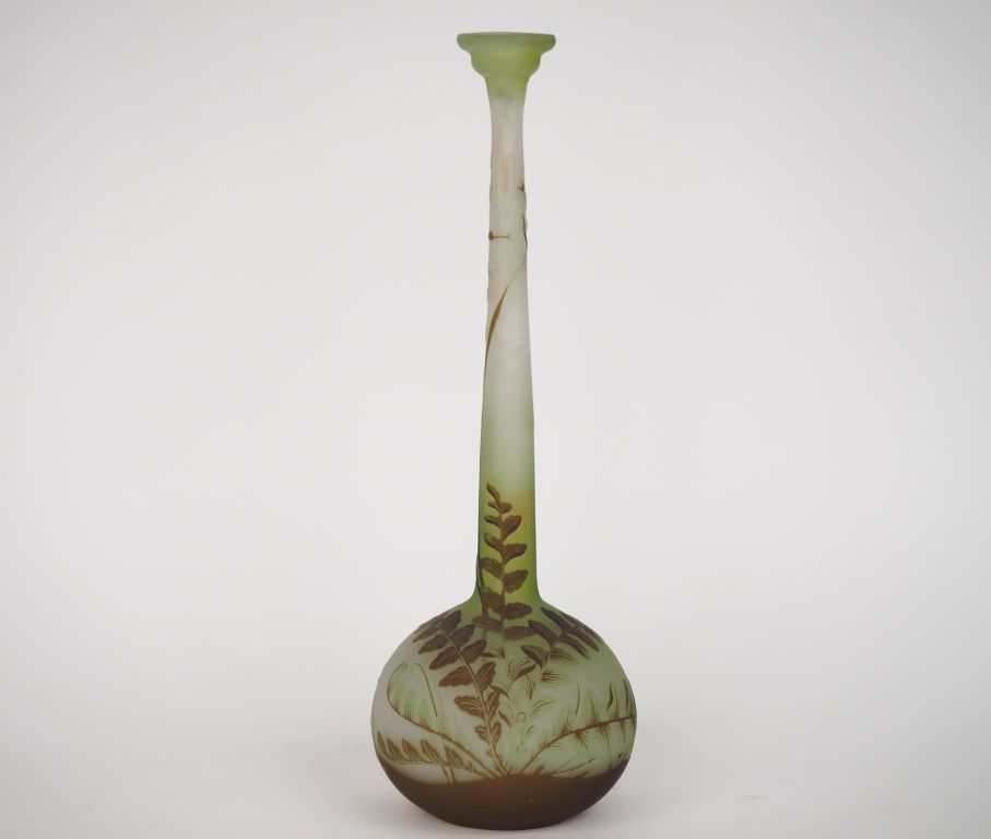 GALLE. Soliflore en verre à décor gravé en camée et à l'acide de feuillage sur fond blanc nuancé de vert Signé H. 30,5 cm