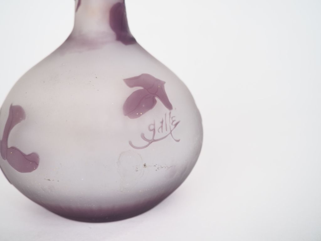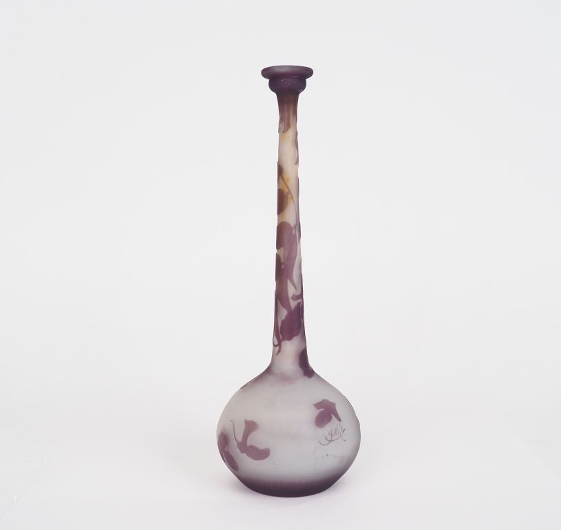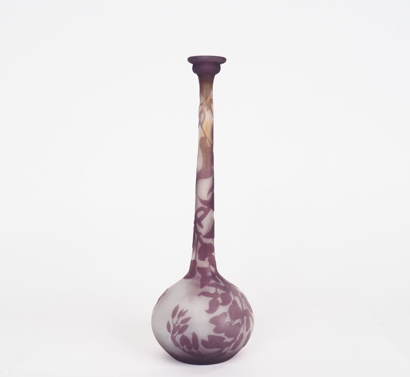 GALLE. Soliflore en verre gravé en camée à l’acide à décor de glycine mauve sur fond clair. Signé. H. 30.5 cm.