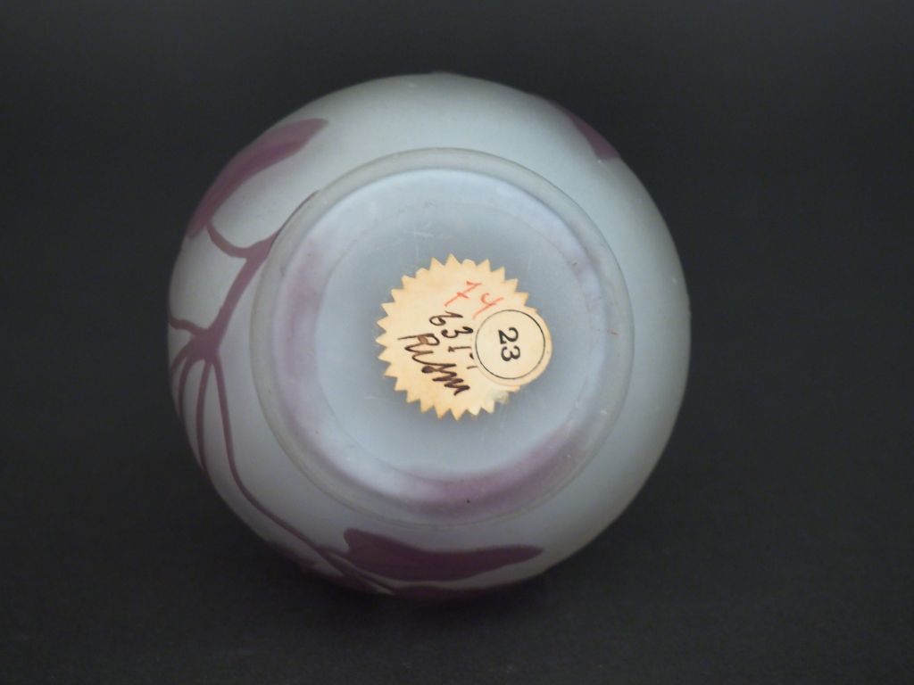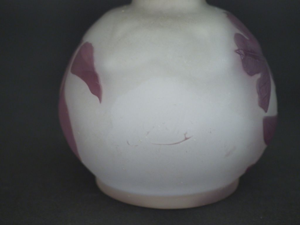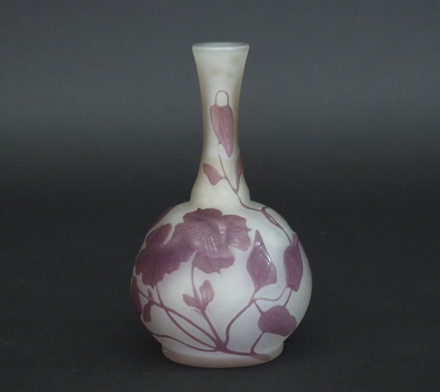 GALLE. Vase en verre à décor gravé en camée à l'acide de fleurs mauves sur fond clair. Signé H. 14 cm