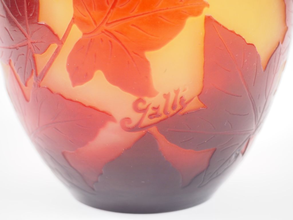 GALLE. Vase en verre à décor gravé en camée à l'acide de fleurs rouges sur fond jaune. H. : 23 cm.