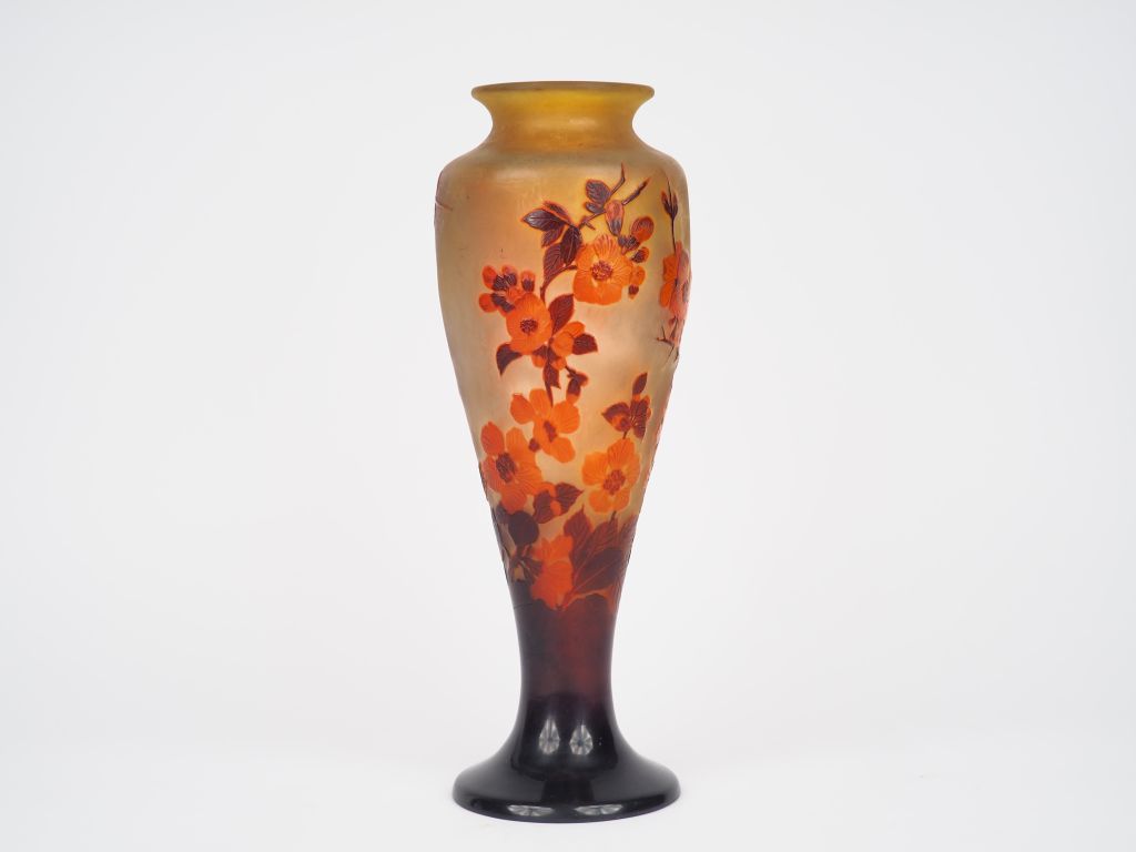 GALLE. Vase en verre à décor gravé en camée et à l'acide de fleurs rouges sur fond de jaune. Signé. H. 39 cm.