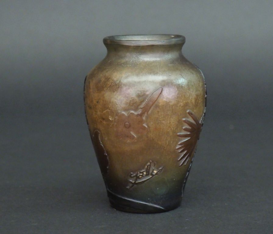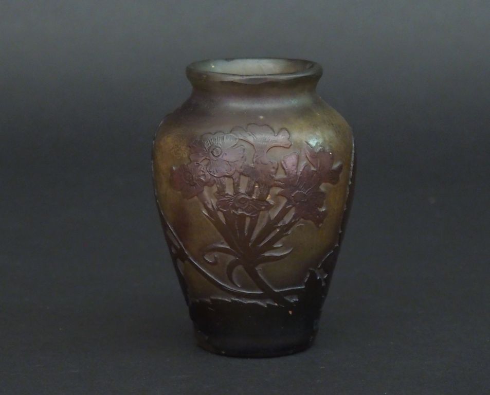 GALLE. Vase ovoide en verre à décor gravé en camée à l'acide de fleurs en camaieu brun. Signé H. 9 cm