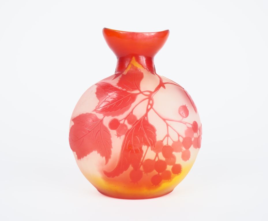 GALLE. Vase ovoïde en verre à décor gravé en camée à l'acide de groseilles rouges sur fond blanc et jaune. Ouverture du col oblongue. Signé H. 15 cm.