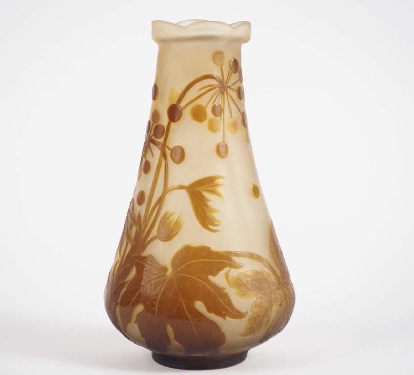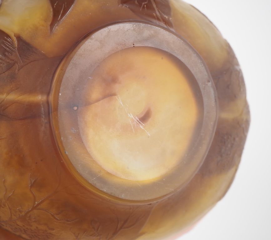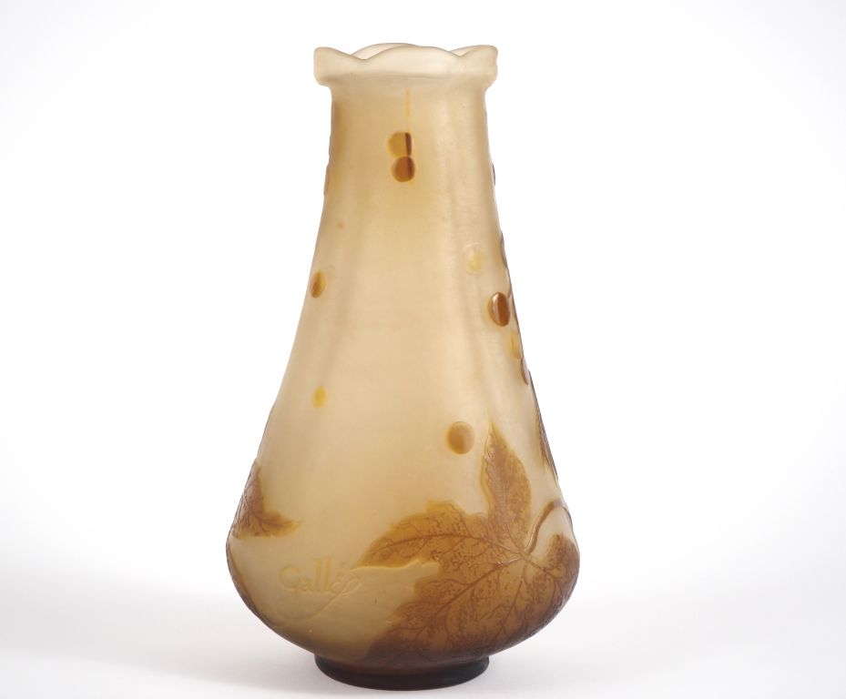 GALLE. Vase ovoide en verre à décor gravé en camée et à l'acide de fleurs et de feuillage brun sur fond clair. H. 26 cm Signé