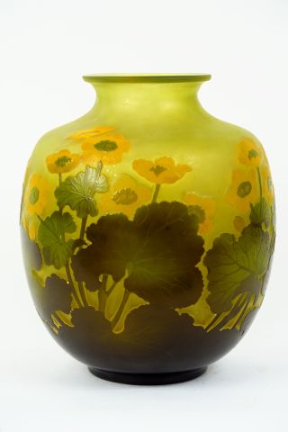 GALLE. Vase ovoïde en verre, à décor gravé en camée et à l'acide de fleurs jaunes sur fond vert clair. Signé (signature japonisante). H. : 28 cm