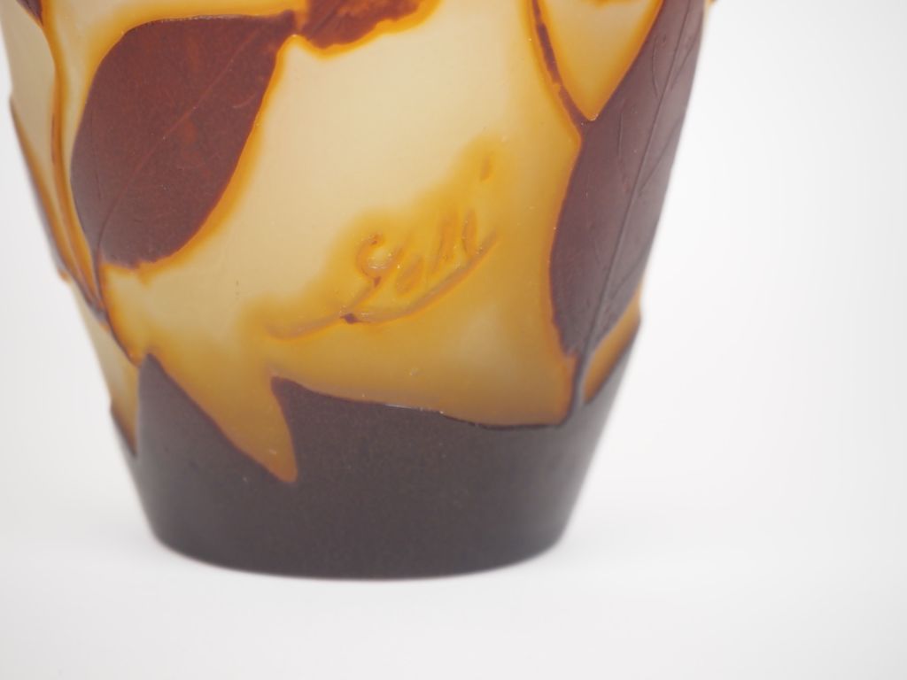GALLE. Vase ovoide en verre à décor gravé en camée et à l'acide de fleurs dans des tonalités brune sur fond clair nuancé de vert. Signé. H. 12 cm