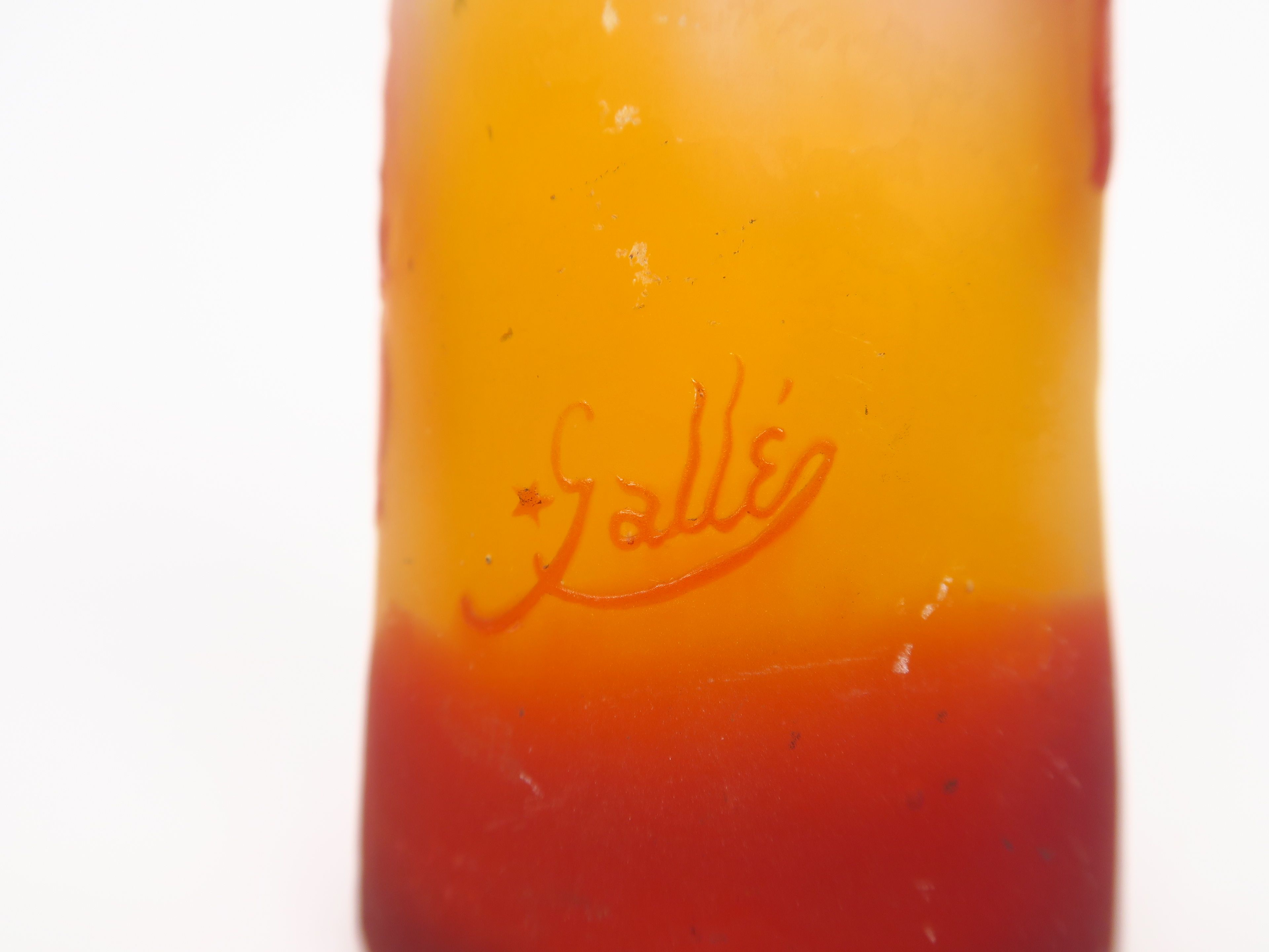 GALLE. Vase rouleau à col quadrilobé en verre, à décor gravé en camée et à l'acide de noisietiers fushia sur fond blanc, jaune et rose. Signé (signature à l'étoile). H. 20 cm (petite égrenure à la base)