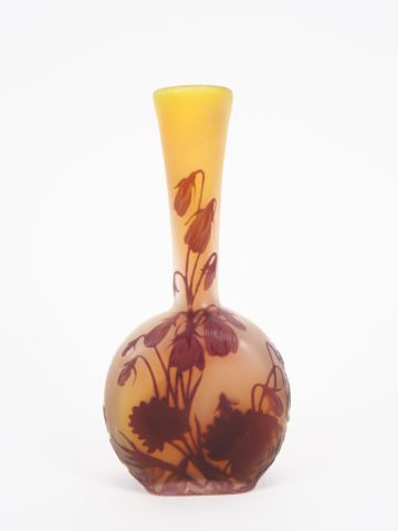 GALLE. Vase soliflore en verre, à décor gravé en camée et à l'acide de feuillage brun sur fond jaune (égrenure). Signé. H. 14 cm