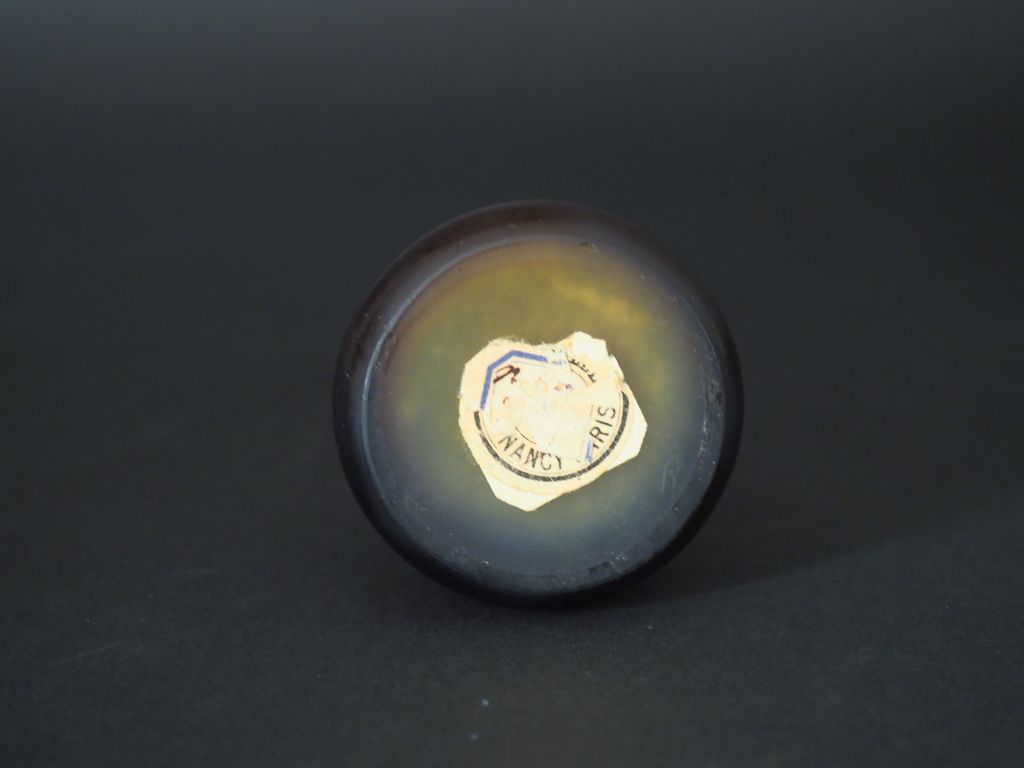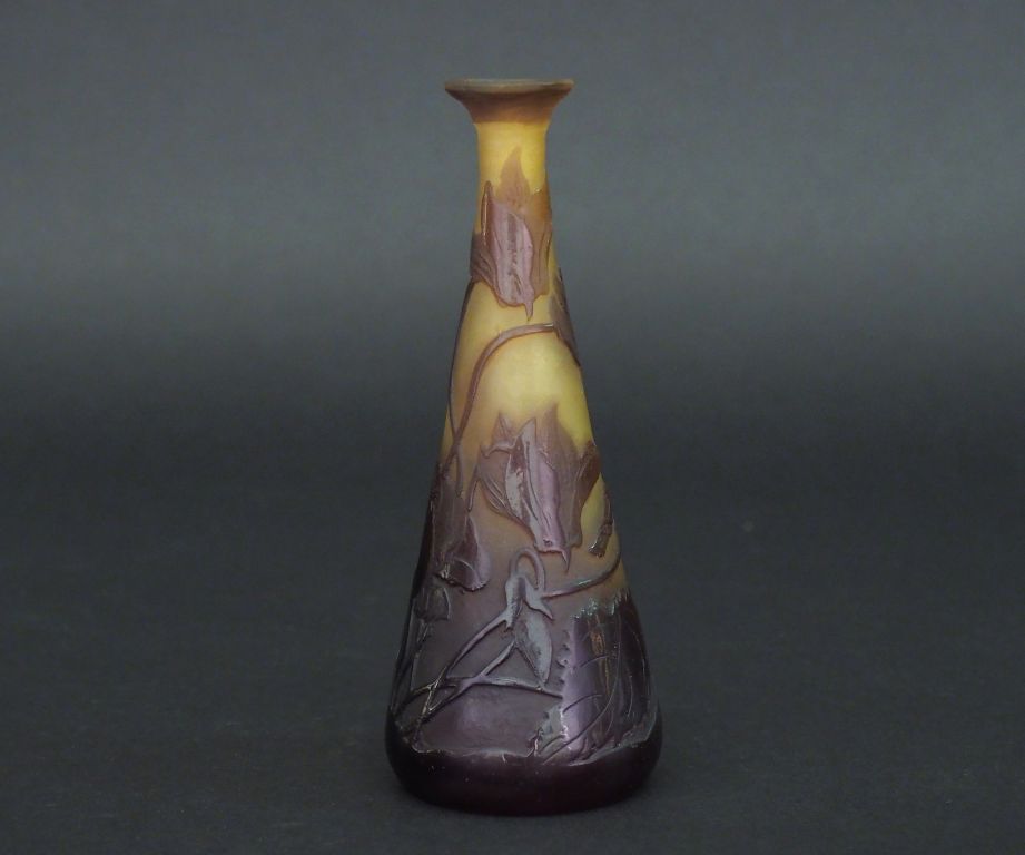 GALLE. Vase soliflore en verre à décor gravé en camée et à l'acide de crocus bruns sur fond jaune. Signé H. 13 cm