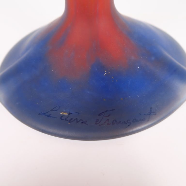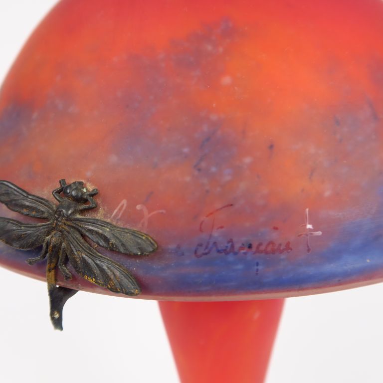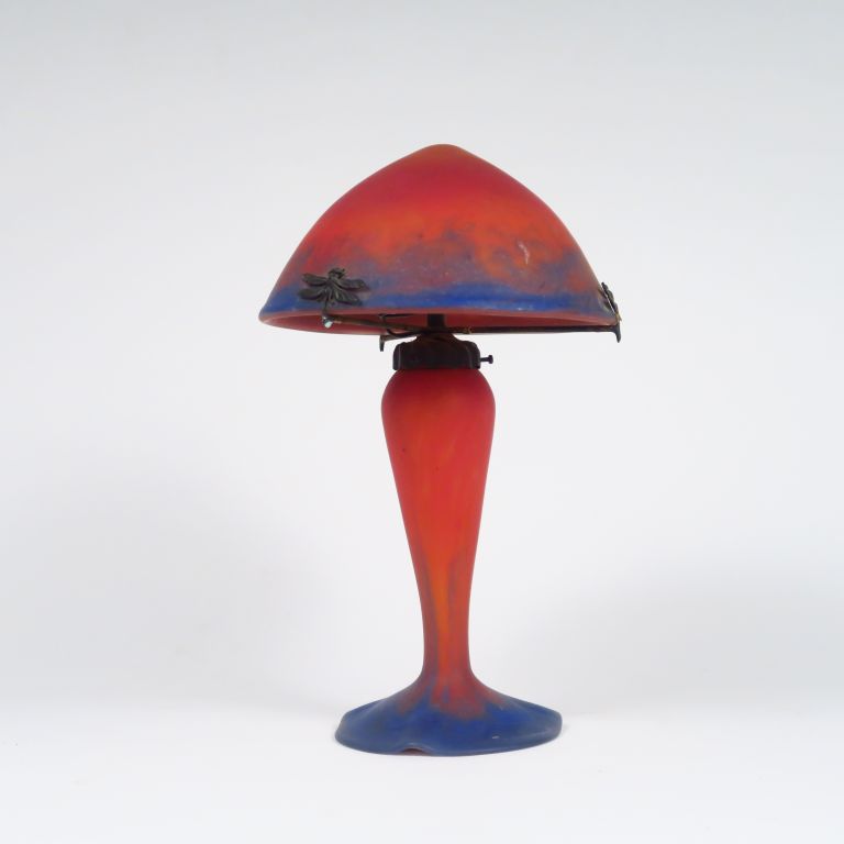 LE VERRE FRANCAIS. Lampe en verre poudré orange et bleu, monture en bronze à décor de libellules. H. : 37,5 cm.