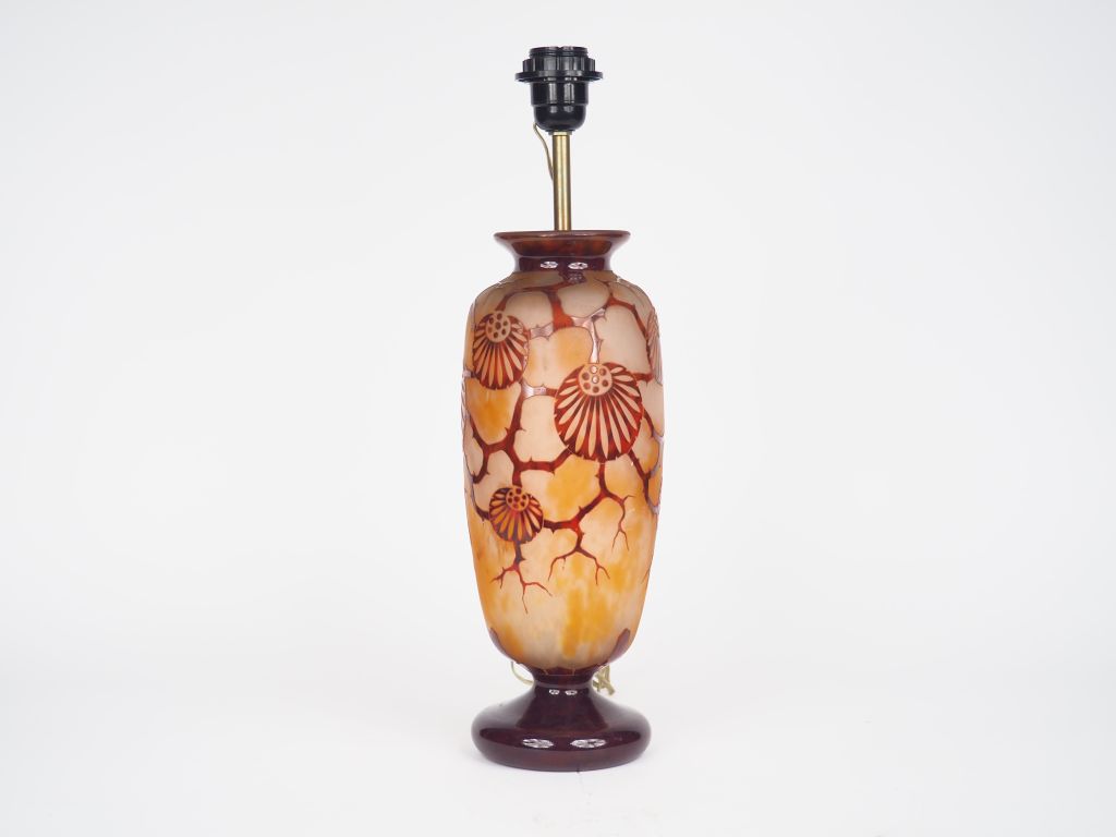 LE VERRE FRANCAIS. Vase "Epinettes" en verre poudré jaune et orange doublé de verre poudré violet brun, motif dégagé à l'acide. Signé. H. 35 cm.