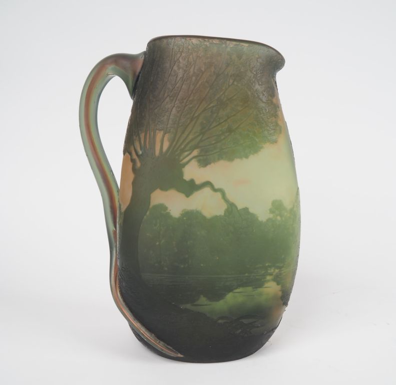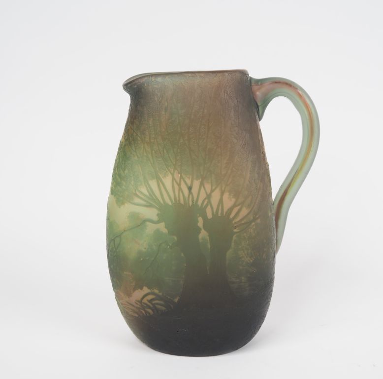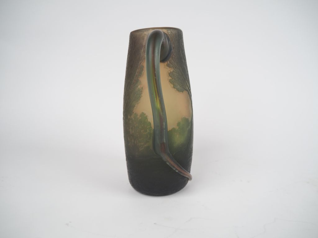 LEGRAS. Pichet en verre à décor gravé en camée et à l'acide de paysage lacustre. H. 21 cm. (micro égrenure à l'extrémité de l'anse)